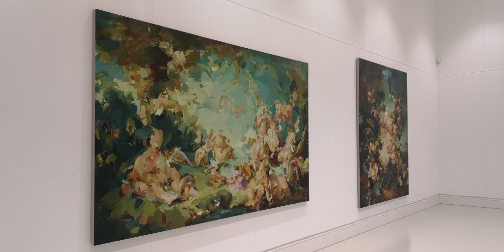 After reading an article about her in the TOAST magazine, I had hoped to visit the home studio of Yukhnovich as her work is one that really interested me. However, due to travel and lack of availability at the time, I was unable to do so; so you can imagine my sheer excitement when I found her work was to be displayed at Leeds Arts University, and of course we had to go explore it!
